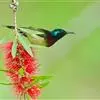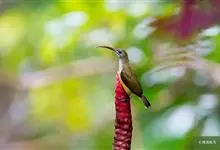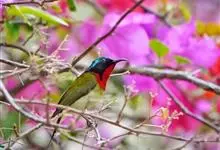 绿喉太阳鸟:共有9个亚种。小型鸟类,雄鸟体长13-15厘米、雌鸟10-12厘米。雄鸟前额至后颈、颏和喉辉绿色,头侧黑色,颈侧和背暗红色,两肩、下背橄榄绿色,腰鲜黄色,尾上覆羽和中央尾羽暗绿色,…全部>>