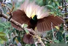 大极乐鸟是极乐鸟属中最大的鸟种。成年雄鸟体长可达到43厘米,雌性可达35厘米。雄鸟的额、颊、喉等墨绿色;头、颈黄色;上体暗赤栗色;腹部葡萄红色,胁部有长饰羽,其基部橙黄,中部黄色,…全部>>