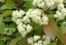 石楠 Kalkman),是蔷薇科石楠属的常绿乔木,高5~12米,株型紧凑,树冠圆球形。树枝为褐灰色;鳞片为褐色,没有毛;叶片革质,长椭圆至侧卵状椭圆形,有锯齿,新叶红色光亮。复伞房花序,白色小花,…全部>>