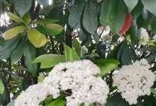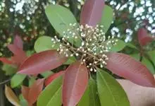 石楠 Kalkman),是蔷薇科石楠属的常绿乔木,高5~12米,株型紧凑,树冠圆球形。树枝为褐灰色;鳞片为褐色,没有毛;叶片革质,长椭圆至侧卵状椭圆形,有锯齿,新叶红色光亮。复伞房花序,白色小花,…全部>>