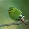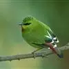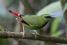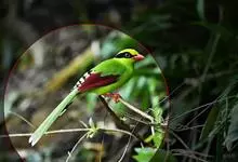 火尾绿鹛是莺科、绿鹛属小型鸟类,体长11-14厘米。上体绿色,头顶至枕具黑色鳞状斑,眼先和眼后黑色,眉纹黄绿色。两翅黑色具黄色和红色翅斑及白色端斑,极为醒目。中央一对尾羽绿色,外侧尾羽鲜红色。…全部>>