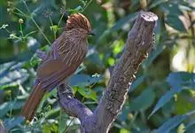 条纹噪鹛是画眉科、噪鹛属中型鸟类,体长28-32厘米。头具短的羽冠,上体栗褐色,飞羽外翻蓝灰色。下体棕栗色,腹以后转为褐白色。除飞羽和尾羽外,所有上、下体羽均具白色羽干纹。极为醒目。野外特征明显,…全部>>