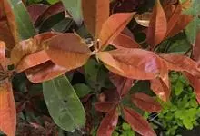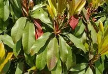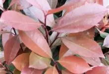红叶石楠 是蔷薇科,石楠属杂交种,为常绿小乔木或灌木,乔木高可达5米、灌木高可达2米。叶片革质,长圆形至倒卵状、披针形,叶端渐尖,叶基楔形,叶缘有带腺的锯齿,花多而密,复伞房花序,花白色,梨果黄红色,…全部>>