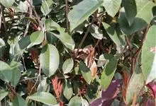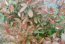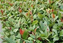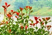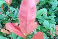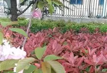 红叶石楠 是蔷薇科,石楠属杂交种,为常绿小乔木或灌木,乔木高可达5米、灌木高可达2米。叶片革质,长圆形至倒卵状、披针形,叶端渐尖,叶基楔形,叶缘有带腺的锯齿,花多而密,复伞房花序,花白色,梨果黄红色,…全部>>
