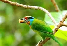 蓝喉拟啄木鸟,是须鴷科、拟啄木鸟属的鸟类。蓝喉拟啄木鸟为小型鸟类,体长20-23厘米。前额至头顶鲜红色,其上有一宽阔的黑色横带,将此红色分为前后二块;头侧、颏、喉蓝色,下喉两侧各具一红色点斑。…全部>>