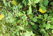 刺天茄,是茄科茄属的多年生草本植物。茎直立,枝条有刺;叶片大,互生,卵形或椭圆形,有长柄,叶面有短柔毛;花单生于枝顶,外面密被星状绒毛及细直刺,果被星状毛及直刺,浆果球形,光亮,…全部>>