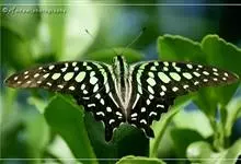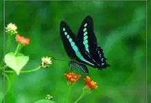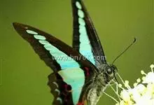 青带凤蝶Graphium sarpedon ,又名青凤蝶,是最普遍的中型凤蝶,飞行速度很快。青带凤蝶的翅膀中央有许多浅蓝色的斑点,很整齐地排列成一条直线。这些斑点由上而下逐渐变大,就像一条青色的带子。全部>>