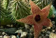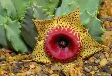 巨花犀角又称大豹皮花,是夹竹桃科犀角属的一种植物。茎粗,花大,边缘生长细毛。植株柱形多分枝呈丛生,柱形具4棱,棱缘具细小疣突。花大,五角星形黄色,并有横向棕褐色斑纹,似豹皮而得名。花期夏秋两季。…全部>>