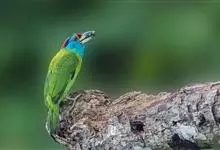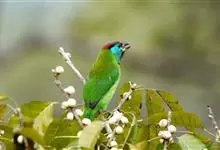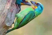 绿拟啄木鸟为鴷形目,须科,拟啄木属的一种。形较大拟啄木鸟略小,体长约260mm。头、颈及胸浅褐而具淡黄白色条纹;喉几为淡黄白色;身体余部草绿色。虹膜棕褐色,眼周裸露部黄色;嘴峰角黄色;跗跖和趾角黄…全部>>