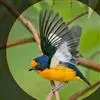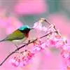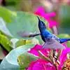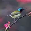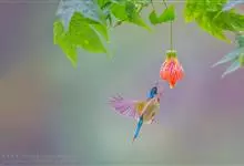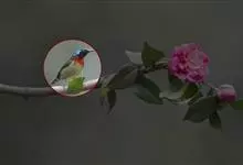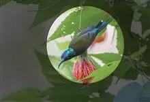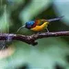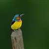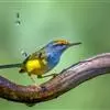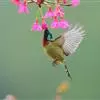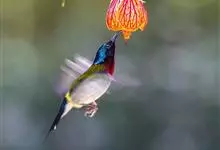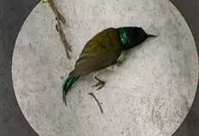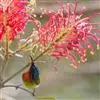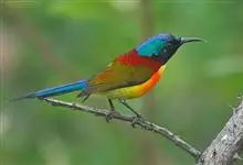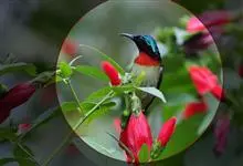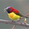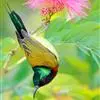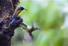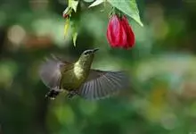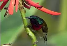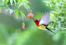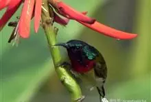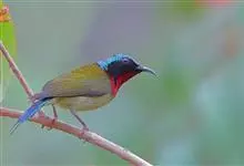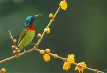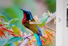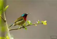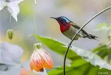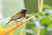 绿喉太阳鸟:共有9个亚种。小型鸟类,雄鸟体长13-15厘米、雌鸟10-12厘米。雄鸟前额至后颈、颏和喉辉绿色,头侧黑色,颈侧和背暗红色,两肩、下背橄榄绿色,腰鲜黄色,尾上覆羽和中央尾羽暗绿色,…全部>>