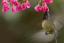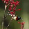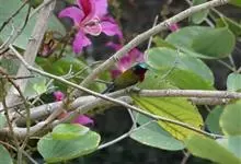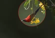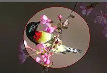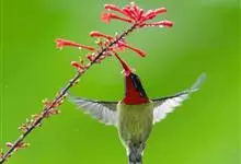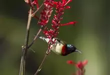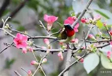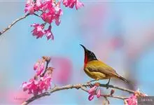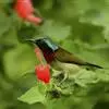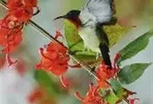 叉尾太阳鸟,雀形目太阳鸟科太阳鸟属留鸟;为小型鸟类,雄鸟头顶辉蓝绿色,上体橄榄绿色,腰明黄色,中央尾羽亮翠蓝色,羽轴针状延长,外侧尾羽黑色具白色端斑,头侧黑色,颜、喉和胸为绛红色,…全部>>