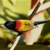 黑胸太阳鸟:小型鸟类,体长9-15厘米。嘴细长而向下曲。雄鸟中央尾羽特长,尾呈楔形,头顶至后颈紫蓝色具金属光泽;背褐红色,腰有一黄色横带,尾上覆羽和尾紫蓝色;颏、喉和上胸乌黑色,有的下胸为硫黄色,…全部>>