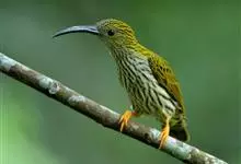 纹背捕蛛鸟:为太阳鸟科捕蛛鸟属的鸟类。是太阳鸟科中体型较大的一种,体重25-45克,体长160-210毫米。嘴粗长而尖且向下弯曲。上体橄榄黄色具黑色中央斑纹。下体淡黄白色满布黑色纵纹,尾具黑色次端斑。…全部>>