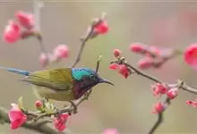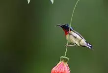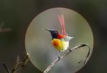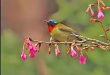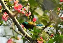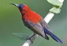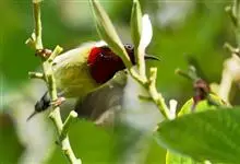 叉尾太阳鸟,雀形目太阳鸟科太阳鸟属留鸟;为小型鸟类,雄鸟头顶辉蓝绿色,上体橄榄绿色,腰明黄色,中央尾羽亮翠蓝色,羽轴针状延长,外侧尾羽黑色具白色端斑,头侧黑色,颜、喉和胸为绛红色,…全部>>