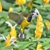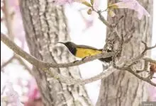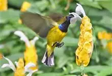 黄腹花蜜鸟是雀形目太阳鸟科花蜜鸟属鸟类。体型较小、喙略短而弯、腹部黄色。雄鸟繁殖季节颏及胸黑紫色并泛金属光泽,具有绯红色及灰色胸带,将上腹部黑色斑与前胸隔开,肩斑为橙黄色丝质羽,上体橄榄绿色,…全部>>