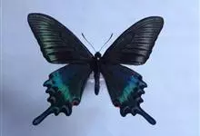巴黎翠凤蝶中型凤蝶,躯体黑褐色,散布绿色亮鳞。后翅M3脉端有一明显叶状尾突。翅背面底色黑褐色,密布亮鳞,后翅前侧有一枚蓝绿色亮斑,与后翅中央之绿色亮线连接。后翅臀区有一紫红色圈纹。翅腹面底色褐色,于…全部>>