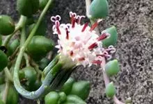 绿玉菊为菊科千里光属多年生肉质植物。植株匍匐或悬垂、向上攀援生长,茎圆柱形,红褐色,叶互生,具叶柄,肉质,很脆,易折断,叶色深绿,有浅色的脉纹,小花乳白色,有黄心。绿玉菊原产非洲南部,…全部>>
