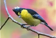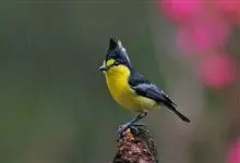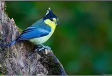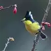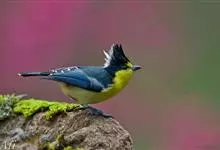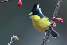 台湾黄山雀体长约13厘米。头顶至后颈黑色,有一长的黑色羽冠,羽冠末端和后颈中央白色。背苍绿色,两翅和尾黑色,羽缘蓝灰色,外侧尾羽白色。额基和下体鲜黄色,尾下覆羽白色,雄鸟腹部有一黑斑。…全部>>