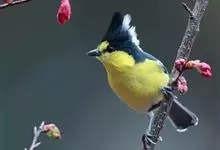 台湾黄山雀体长约13厘米。头顶至后颈黑色,有一长的黑色羽冠,羽冠末端和后颈中央白色。背苍绿色,两翅和尾黑色,羽缘蓝灰色,外侧尾羽白色。额基和下体鲜黄色,尾下覆羽白色,雄鸟腹部有一黑斑。…全部>>