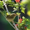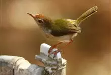 普通缝叶莺,是雀形目鹅科莺亚科缝叶莺属一种。体长10-14厘米,体重7-10克,雄鸟前额棕红,头顶至枕棕橄榄褐,上体橄榄绿染黄,飞羽及尾羽暗褐;繁殖期雄鸟的中央尾羽特形延长,下体淡皮黄白色。…全部>>