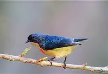 红胸啄花鸟:体重5-10克,体长60-92毫米。体形纤小。雄鸟上体呈辉亮的金属绿色;下体棕黄,胸部具一朱红色块斑,极易与其他啄花鸟区别。雌鸟上体呈橄榄绿,下体棕黄色。虹膜褐色,嘴褐黑色或角灰色,…全部>>