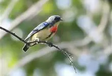红胸啄花鸟:体重5-10克,体长60-92毫米。体形纤小。雄鸟上体呈辉亮的金属绿色;下体棕黄,胸部具一朱红色块斑,极易与其他啄花鸟区别。雌鸟上体呈橄榄绿,下体棕黄色。虹膜褐色,嘴褐黑色或角灰色,…全部>>