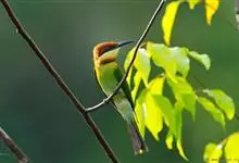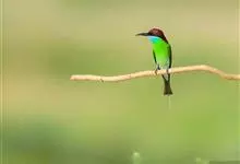 栗喉蜂虎是蜂虎科蜂虎属的鸟类。有热带鸟类羽毛艳丽的特征:喉部是栗红色的,黑色的过眼纹,翅膀和背部是绿色的,尾翼是蓝色的,飞行时翅膀下面的羽毛是橙黄色的,在阳光的照射下,它们全身闪烁着金属般的艳丽光泽,…全部>>