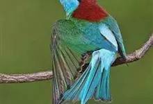 蓝喉蜂是蜂虎科蜂虎属鸟类。体长26-28厘米,嘴长而弯曲,有明显细长的中央尾羽。头部、颈部和背部为巧克力色,有黑色眼纹。喉部、腰部和尾羽为蓝色。腹部和两翼为绿色。幼鸟外观似成鸟,头部、颈部和背部为绿色,…全部>>