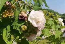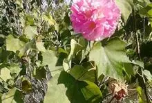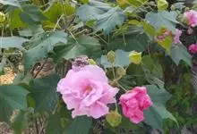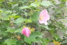 木芙蓉,锦葵科木槿属落叶灌木或小乔木。小枝上有细绒毛;叶片为卵状心形,托叶为披针形,常早落;花单生,花萼为钟形,花冠初为白色或淡红色,后逐渐变为深红色;果实为扁球形,有淡黄色的毛附着。花期8到10月。…全部>>