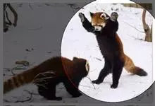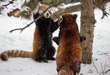 小熊猫:是小熊猫科、小熊猫属的一种动物。雌雄相似,不存在二态性。外形像猫,但较猫肥大,全身红褐色。圆脸,吻部较短,脸颊有白色斑纹。耳大,直立向前。四肢粗短,为黑褐色。尾长、较粗而蓬松,…全部>>