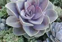 紫珍珠是景天科石莲花属的多年生肉质草本植物。植株中小型;叶片肉质,匙形,呈莲座状紧密排列;叶片粉紫色,叶缘呈粉白色,光照充足时颜色亮丽,不足时叶色会呈现深绿色或灰绿色,叶面光滑,被轻微白粉,…全部>>