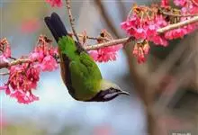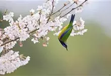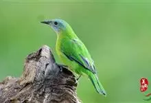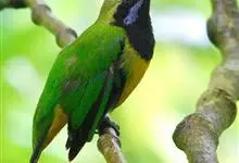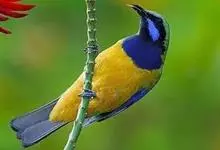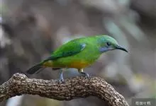 橙腹叶鹎体形大小和金额叶鹎相似,体长16~20厘米。额至后颈黄绿色,其余上体绿色,小覆羽亮钴蓝色,形成明显的肩斑。颏、喉、上胸黑色具钴蓝色髭纹,其余下体橙色。飞羽和尾羽雄鸟黑色、雌鸟绿色。…全部>>