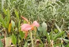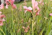 粉美人蕉:是一种球根草本植物。根茎延长,株高1.5-2米;茎绿色。叶片披针形;总状花序疏花,单生或分叉,稍高出叶上;苞片圆形,褐色,花黄色,无斑点;有多种园艺栽培品种,颜色从粉、橙红色及具带红色斑点…全部>>
