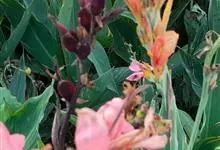 粉美人蕉:是一种球根草本植物。根茎延长,株高1.5-2米;茎绿色。叶片披针形;总状花序疏花,单生或分叉,稍高出叶上;苞片圆形,褐色,花黄色,无斑点;有多种园艺栽培品种,颜色从粉、橙红色及具带红色斑点…全部>>