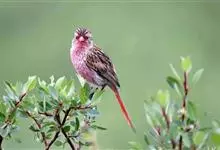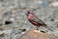 红眉朱雀:体长15厘米,是一种中等体型的朱雀。上体褐色斑驳,眉纹、脸颊、胸及腰淡紫粉,臀近白。雌鸟无粉色,但具明显的皮黄色眉纹。雄雌两性均甚似体型较小的曙红朱雀,但嘴较粗厚且尾的比例较长。…全部>>
