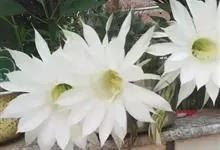 仙人球花 仙人掌科,仙人球属。植株单生或成丛。幼株球形,老株长成圆筒状,高可达75厘米,直径12-15厘米。球体暗绿色,具棱11-12。刺锥状,黑色,长1-1.5厘米。花着生于球体侧方,大型嗽喇叭状…全部>>