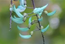 翡翠葛是豆科翡翠葛属植物,多年生常绿大型藤本,茎木质,直径可达30厘米,长可达21.3米。三出复叶,革质光亮,小叶长椭圆形,长7.6-12.7厘米,中间小叶最长。花两性,春季至初夏开花,蓝绿色,…全部>>