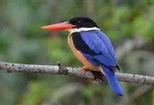 鹳嘴翡翠:体长33-37厘米。体重140-200克。共有13个亚种,体型大,嘴形巨大、侧扁,似鹳嘴,红色,嘴峰两侧有鼻沟。头灰褐色,上体蓝色,下体和宽阔的领环赭土色,脚红色。飞翔时翅上无斑。全部>>