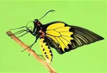 金裳凤蝶是凤蝶科、裳凤蝶属的动物。金裳凤蝶身体呈黑色,头、颈和胸侧有红毛,腹部有黑黄两色相间条纹,雄蝶前翅黑色,具黑天鹅绒光泽,各脉两侧灰白色,后翅金黄色,各室外缘有等腰三角形黑斑1枚,斑内侧有晕,…全部>>