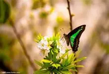 青带凤蝶Graphium sarpedon ,又名青凤蝶,是最普遍的中型凤蝶,飞行速度很快。青带凤蝶的翅膀中央有许多浅蓝色的斑点,很整齐地排列成一条直线。这些斑点由上而下逐渐变大,就像一条青色的带子。全部>>