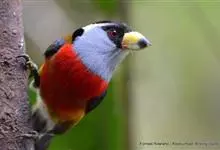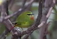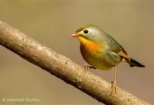 银耳相思鸟小型鸟类,体长14~18厘米。头顶黑色,耳羽银灰色,前额橙黄色;外侧飞羽橙黄色,基部朱红色,极为鲜艳、醒目。尾圆形,尾上、尾下覆羽朱红色,尾暗灰褐色,外侧尾羽橙黄色,其余上体橄榄绿或橄榄黄色。…全部>>