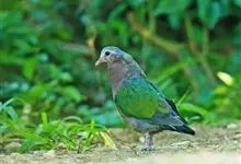 绿背金鸠体长约25厘米,是中等体型、尾甚短的地栖型斑鸠。下体粉红,头顶灰色,额白,腰灰,两翼具亮绿色。雌鸟头顶无灰色。飞行时背部两道黑色和白色的横纹清晰可见。主要栖息于2000米以下的山地森林中,…全部>>