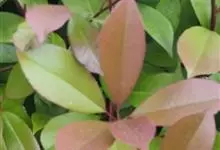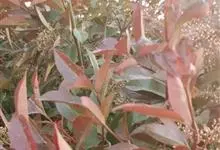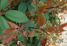 红叶石楠 是蔷薇科,石楠属杂交种,为常绿小乔木或灌木,乔木高可达5米、灌木高可达2米。叶片革质,长圆形至倒卵状、披针形,叶端渐尖,叶基楔形,叶缘有带腺的锯齿,花多而密,复伞房花序,花白色,梨果黄红色,…全部>>