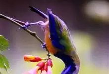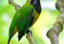 橙腹叶鹎体形大小和金额叶鹎相似,体长16~20厘米。额至后颈黄绿色,其余上体绿色,小覆羽亮钴蓝色,形成明显的肩斑。颏、喉、上胸黑色具钴蓝色髭纹,其余下体橙色。飞羽和尾羽雄鸟黑色、雌鸟绿色。…全部>>