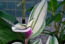 吊竹梅是鸭跖草科紫露草属的多年生草本植物;茎半肉质,柔弱披散至悬垂;叶椭圆形至长圆形,无柄,先端急尖至渐尖,基部鞘状抱茎,叶面紫绿色而杂有银白色,叶背紫色,全缘;花聚生于顶生叶状苞内,…全部>>