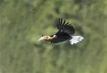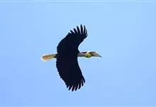 花冠皱盔犀鸟雄鸟体长约105厘米,雌鸟较小。尾白,雄雌两性的背、两翼及腹部均为黑色,但雄鸟头部奶白色,枕部具略红的丝状羽,裸出的喉囊上具明显的黑色条纹。雌鸟头颈黑,喉囊蓝色。成对或小群飞于森林上空,…全部>>