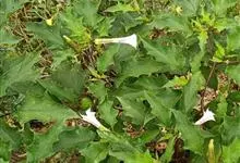 洋金花是茄科曼陀罗属植物,一年生草本植物,全株近于无毛。茎直立,圆柱形,高30~100cm,基部木质化,上部呈义状分枝。叶互生,上部的叶近于对生;叶柄长2~6cm,表面被疏短毛;叶片卵形、长卵形或心形,…全部>>