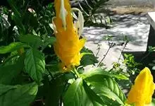 金苞花是爵床科、金苞花属的常绿草本植物。叶长圆形或披针形,先端渐尖,基部通常楔形,下面主脉被微柔毛;顶生穗状花序由密、短的总花梗组成,卵形苞片膜质,下部的近心形,小苞片披针形或匙形,与花萼等长,…全部>>