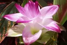 莪术姜科姜黄属多年生草本植物。主根茎陀螺状,淡黄色至白色;叶圆状长圆形至长圆状披针形,中部常有紫斑;花亭自根茎先叶发出,穗状花序阔圆形;苞片卵形,下部绿白色至绿色,上部紫红色;花冠白色或粉红色,…全部>>