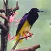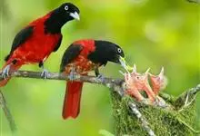朱鹂:中等鸟类,体长23-28厘米。雄鸟绛紫红色,头、上胸及翼黑色。雌鸟上背及背部深灰色,尾覆羽及尾绛紫红色,腹部及下胸白而密布黑色纵纹。与鹊色鹂幼鸟的区别在上背灰色较深,下体白色较少且纵纹较粗。…全部>>